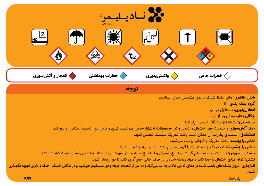 | شکل ظاهری | مایع غلیظ شفاف با بوی مشخص حلال استایرن |
